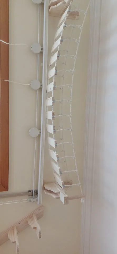 Durch die Nutzung der Wandfläche anstelle der Bodenfläche schafft diese Seilbrücke ein aktives und ansprechendes Element, ohne den Wohnbereich zu überladen. Ideal, um spielerische Wege zu gestalten, selbst auf kleinem Raum.