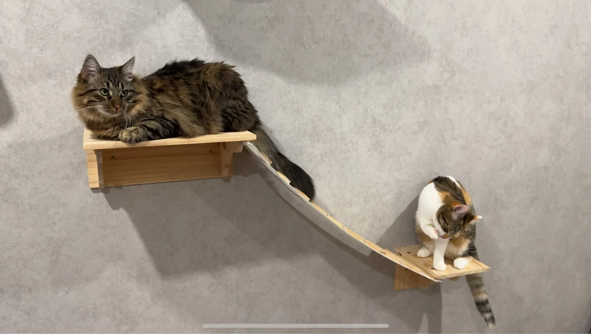 Dieses Wandset mit zwei Plattformen und einer Seilbrücke schafft eine spielerische und dynamische Verbindung innerhalb Ihrer Katzenwand. Es fördert Bewegung, Gleichgewicht und Erkundungsdrang und ist gleichzeitig ein optischer Blickfang an Ihrer Wandgestaltung.