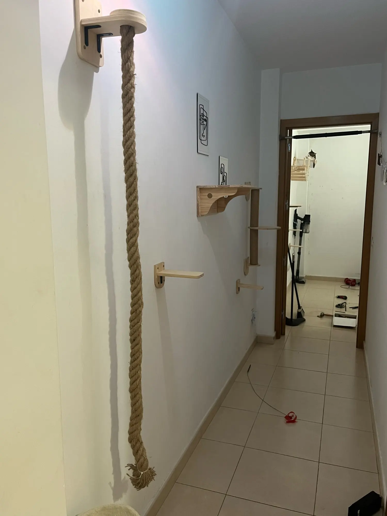 A hanging bridge challenges balance while extending the wall horizontally. The sling rope and scratching post add climbing and scratching opportunities, turning the wall into an active playground. Stepping pieces connect elements dynamically, and the cozy home provides a perfect resting point after intense play.