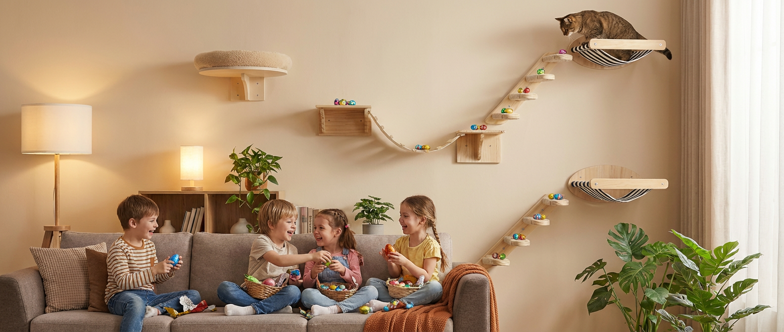 Together these components create a versatile and engaging cat wall layout.